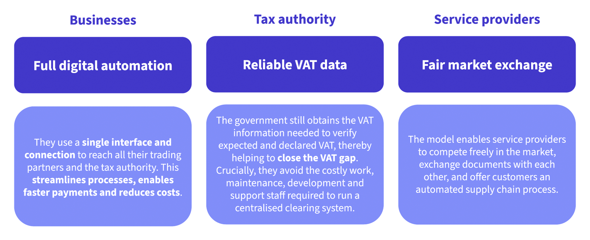 The Decentralised CTC and Exchange Model started to emerge because many of the traditional compliance models, while successful for tax administrations, failed to deliver on the most important promise for the private sector: full business automation. Created and endorsed by global e-invoicing stakeholders, as mentioned above, this model combines the business efficiencies of decentralised exchange with the real-time data needs of the tax authority.