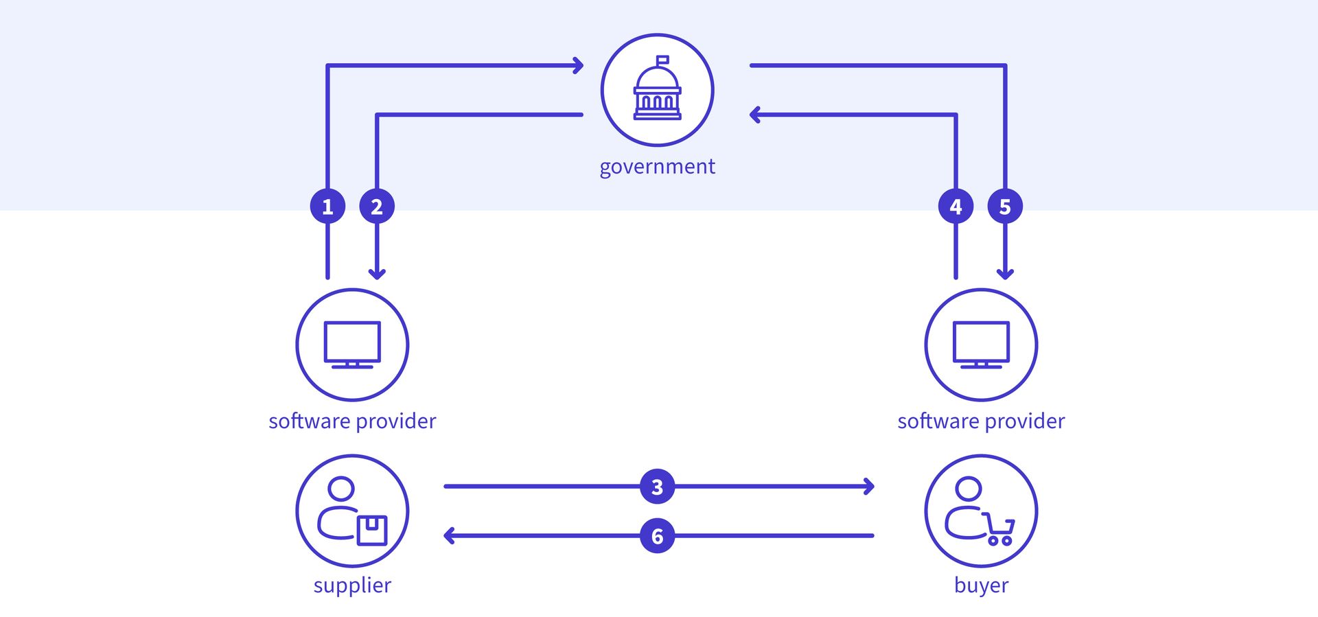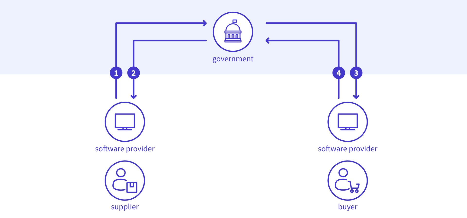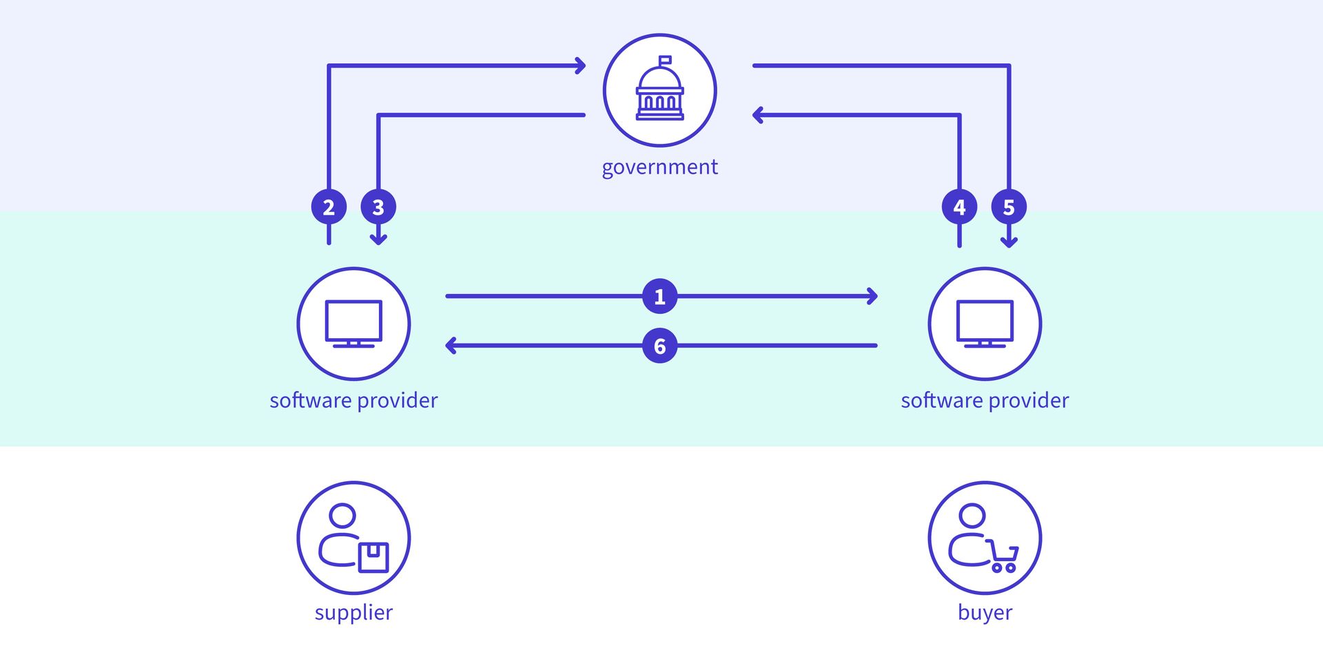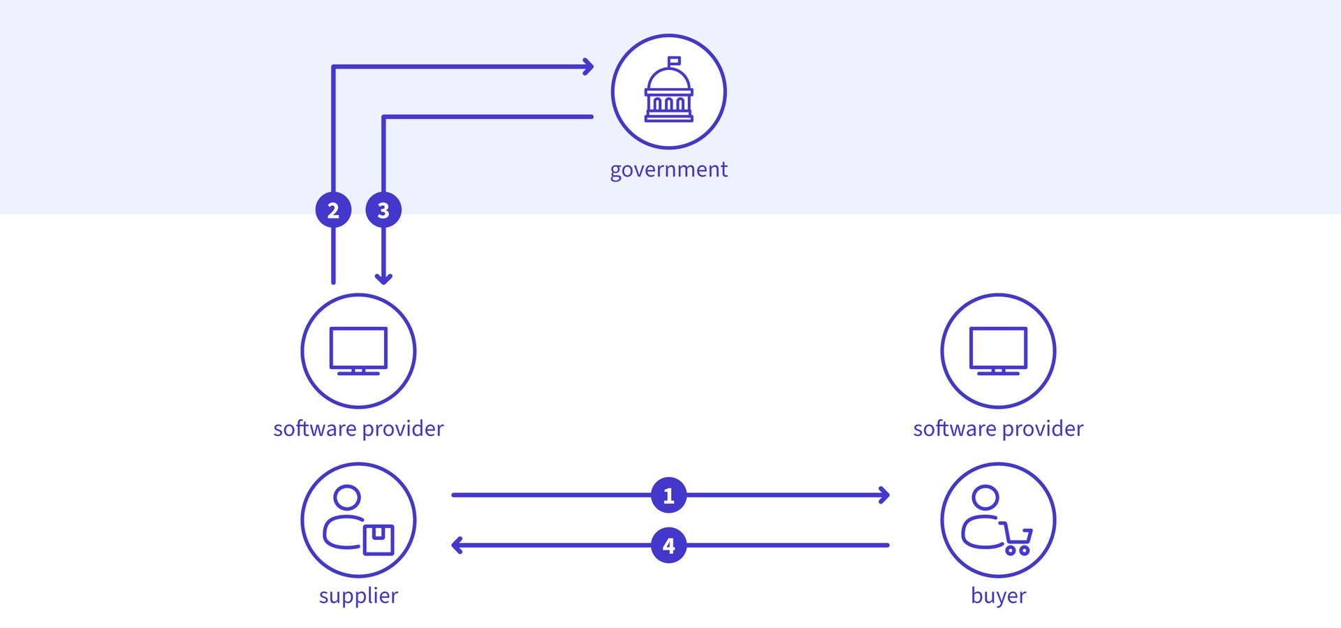 3. Tax authority extracts: The tax authority does not run a central platform or block the invoice flow. Instead, it "sits on top" with a connection to the service provider (the 5th corner) to extract the relevant VAT information in real-time or near-real-time.