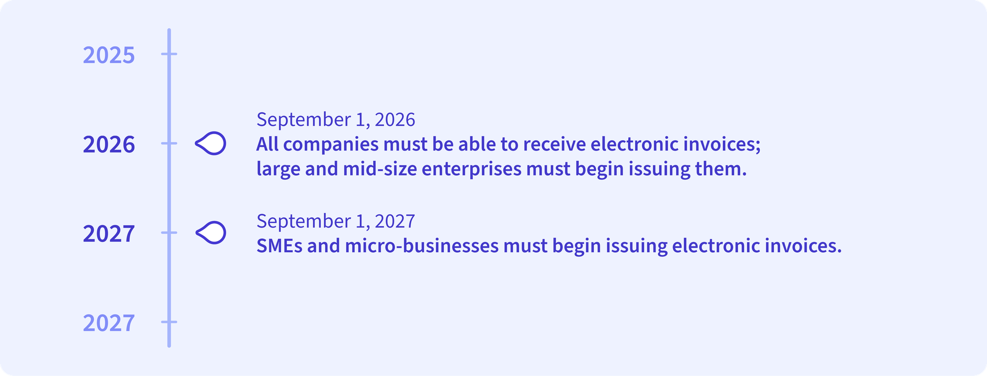 1. 1. September 2026: Alle Unternehmen müssen in der Lage sein, E-Rechnungen zu empfangen, große und mittlere Unternehmen müssen mit der Ausstellung beginnen.