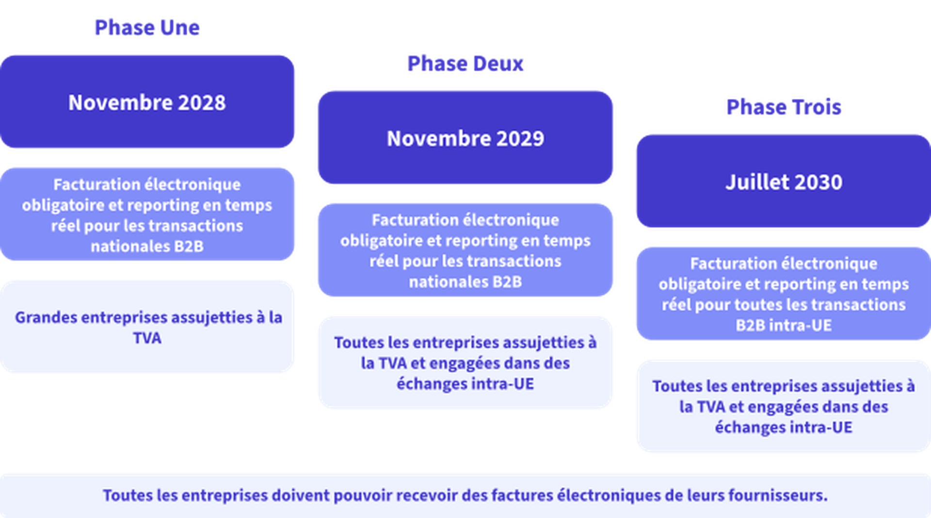 Phase 1 – Novembre 2028 : La facturation électronique obligatoire et le reporting en temps réel commencent pour les grandes entreprises enregistrées à la TVA impliquées dans des transactions B2B nationales. Crucialement, toutes les entreprises doivent être en mesure de recevoir des factures électroniques structurées à cette date. Cette phase affectera principalement un petit nombre d'entreprises qui sont bien placées pour s'adapter aux changements numériques et ont souvent une expérience internationale existante avec des systèmes similaires.