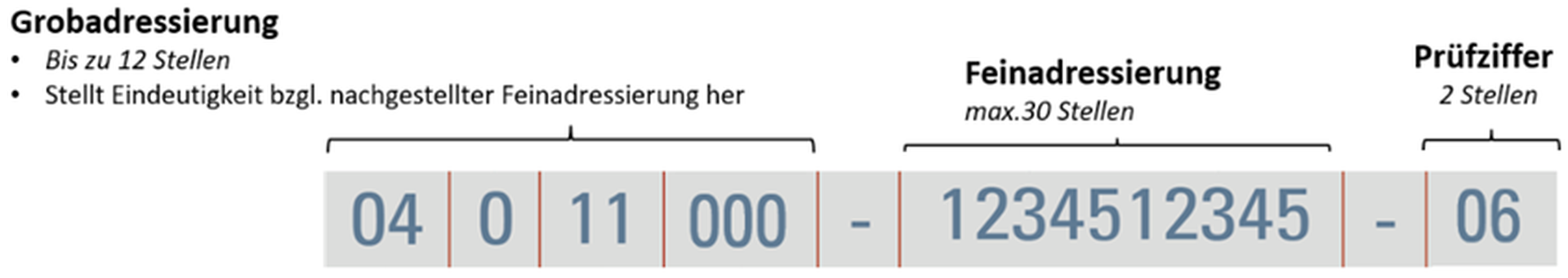 As mentioned, it is made up of three parts, the "Grobadressierung" or basic address, the "Feinadressierung" or specific address, and the "Prüfziffer" or check digit (checksum calculated from the preceding digits). These are separated by a separator corresponding to the hyphen-minus "-" (or "U+002" in Unicode).